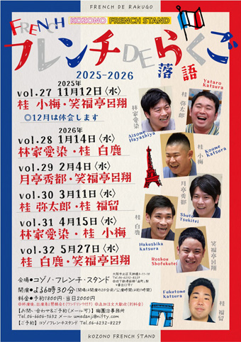 | ▽11月12日(水)18時半開演 「第27回 フレンチDEらくご」 『オープニングトーク』小梅&呂翔・呂翔・小梅 予約1800円/当日2000円※ワンドリンク付 ◎終演後、出演者と懇親会あり※追加注文(別料金)は大歓迎 問い合わせ&予約:06-6606-5632/umedanji@nifty.com事務局