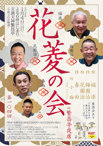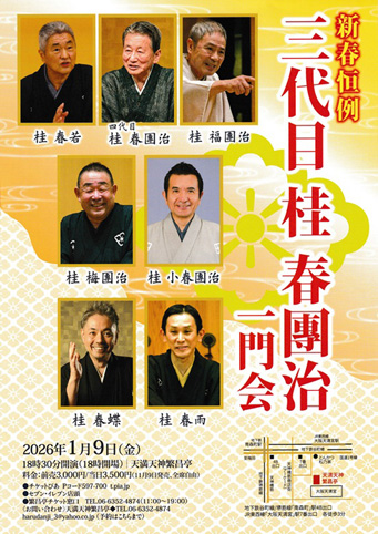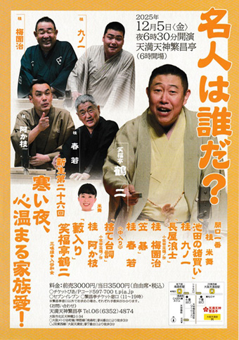 | ▽12月5日(金)18時半開演 「第26回 名人は誰だ?」 米舞・「池田の猪買い」九ノ一・「長屋浪士(小佐田定雄/作)」梅團治・「笠碁」春若 〜中入〜 「捨て台詞(小佐田定雄/作)」阿か枝・「藪入り」鶴二 前売り3000円/・当日3500円※チケットぴあ(Pコード:597-700) 問い合わせ:06-6606-5632梅團治事務所