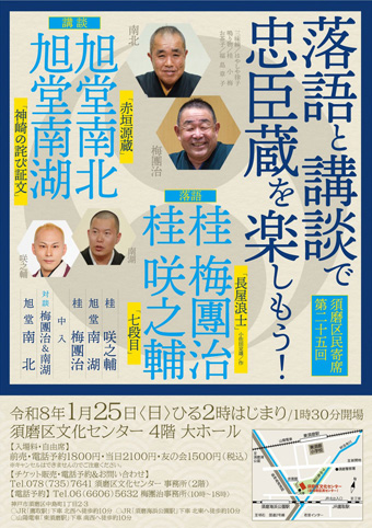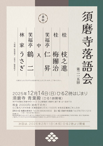 | ▽12月14日(日)14時開演 「第215回 須磨寺落語会」 枝之進・梅團治・仁昇〜中入〜鶴二・うさぎ 山陽電鉄須磨寺北7分、須磨寺青葉殿 名簿登録1500円/初回2000円 問い合わせ:06−6606−5632梅團治事務所(10時〜18時)
