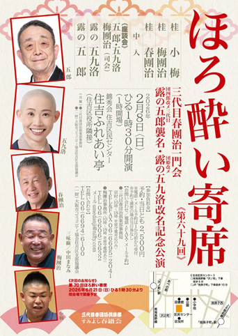 | ▽2月8日(日)13時半開演 「第69回 ほろ酔い寄席〜三代目春團治一門会・ 三代目露の五郎襲名&五九洛改名記念公演」 小梅・梅團治・春團治 〜中入〜 『座談会』五郎、五九洛、梅團治(司会)・五九洛・五郎 南海高野線沢ノ町から徒歩8分、住吉区役所隣接、 住吉区民センター住吉ふれあい亭 前売り・当日とも2500円 問い合わせ&予約 :06-6606-5632 umedanji@nifty.com梅團治事務所