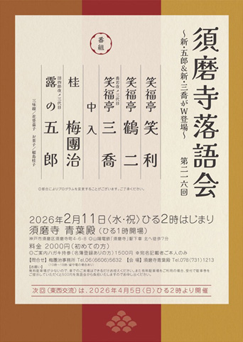 | ▽2月11日(水祝)14時開演 「第216回 須磨寺落語会〜新・三喬&新・五郎がW登場」 笑利・鶴二・三喬 〜中入〜 梅團治・五郎 山陽電鉄須磨寺北7分、須磨寺青葉殿 名簿登録1500円/初回2000円 問い合わせ:06−6606−5632梅團治事務所(10時〜18時)
