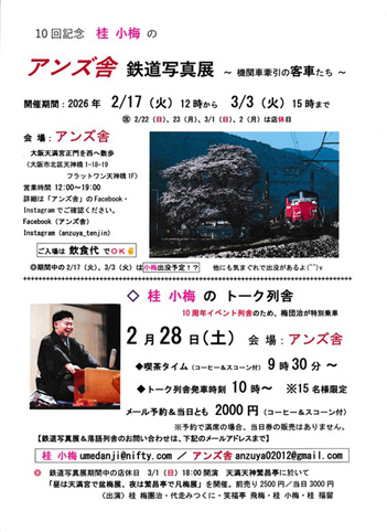 | ▽2月28日(土)9時半喫茶タイム/10時トーク列舎発 「桂 小梅のトーク列舎」 『鉄道トーク』小梅&梅團治 アンズ舎 メール予約・当日とも2000円(コーヒー&スコーン付) ※15名様限定(予約で満席の場合、当日は入れません) 問い合わせ&電話予約:06-6606-5632梅團治事務所
