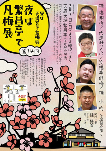 | ▽3月1日(日)18時開演 「第14回 昼は天満宮で盆梅展 夜は繁昌亭で凡梅展」 梅團治・代走みつくに・飛梅・小梅・福留 天満天神繁昌亭 前売り・電話予約2500円/当日3000円※全席自由 (Pコード:597-70 0) 問い合わせ&電話予約:06-6606-5632梅團治事務所