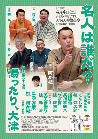 | ▽4月4日(土)18時半開演 「第27回 名人は誰だ?」 喬路・「てんしき」弥太郎・「延陽伯」鶴二・「つぼ算」梅團治 〜中入〜 「天王寺詣り」春若・「こぶ弁慶」阿か枝 前売り3000円/・当日3500円※チケットぴあ(Pコード:597-700) 問い合わせ:06-6606-5632梅團治事務所