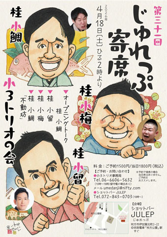| ▽4月18日(土)14時開演 「第31回 じゅれっぷ寄席〜小3トリオの会」 『オープニングトーク』小鯛・小留・小梅・「不動坊」小鯛 予約1500円/当日1800円 問い合わせ&予約:06-6606-5632/umedanji@nifty.com事務局